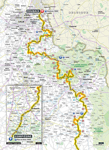 Paris–Roubaix is a one-day professional bicycle road race in northern France, The 114th edition will be running from Compiègne to Roubaix and will cover a total distance of 257.5 kilometres. From its beginning in 1896 until 1967 it started in Paris and ended in Roubaix; in 1966 the start moved to Chantilly and since 1977 it starts in Compiègne (about 85 kilometres (53 mi) north-east from Paris centre). The finish is still in Roubaix. Famous for rough terrain and cobblestones, it is one of the 'Monuments' or classics of the European calendar, and contributes points towards the UCI World Ranking. It has been called the Hell of the North, a Sunday in Hell, the Queen of the Classics or la Pascale: the Easter race. The race is organised by the media group Amaury Sport Organisation annually in mid-April.