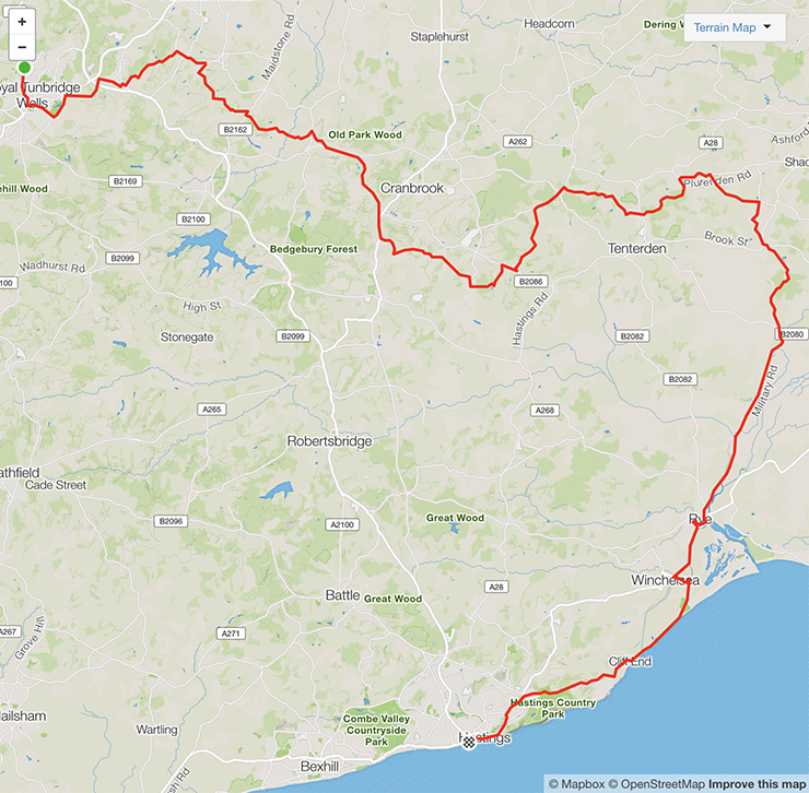 The route is 56 miles (92km) following B roads travelling out through Pembury, towards Matfield, then on to Goudhurst, Hartley, Iden Green. We'll then head north towards St Michaels, Woodchurch and finally travel south through Rye and on to Hastings, finishing at the Pier.